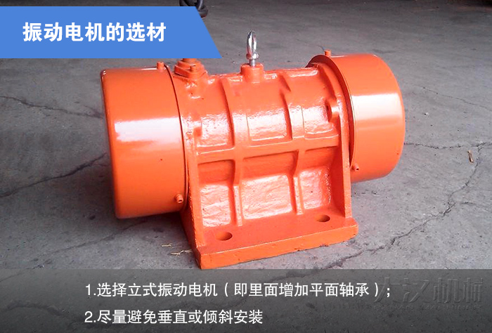 在選材上,盡量使用殼座一體的振動(dòng)電機(jī)(即地腳面在機(jī)殼上),因地腳面是一次加工而成,故能保證其水平。而殼座異體(即地腳面在兩端端蓋上),因地腳面是分次加工,再組裝而成,由于裝配誤差的存在,不易保證其地腳面的水平,這樣幾地腳螺栓的受力就不易均勻,而受力較大的一螺栓就容易松動(dòng),進(jìn)而引起其它螺栓的松動(dòng)、斷裂,燒毀電機(jī)。因?yàn)檎駝?dòng)電機(jī)兩端裝有較重的偏心塊,如垂直或傾斜安裝(即轉(zhuǎn)軸垂直或傾斜水平面),則軸承軸向要承受偏心塊的重力。如果振動(dòng)電機(jī)里無特殊裝置(即平面軸承),將對(duì)軸承產(chǎn)生不良影響,從而縮短使用壽命。