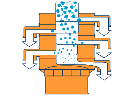 DH-600-3S型篩分機采用YZUL立式振動電機作為激振源,通過振動電機上下兩端的偏心重錘將旋轉(zhuǎn)運動轉(zhuǎn)變?yōu)樗健⒋怪?、傾斜的三次元運動,并傳遞到篩粉機的篩面上;物料通過入料口進(jìn)入設(shè)備內(nèi),根據(jù)不同物料篩分要求,物料經(jīng)過1-5層采用不同目數(shù)的金屬編織篩網(wǎng)的篩分層,在這個過程中,位于各層的篩網(wǎng)下的清網(wǎng)裝置(彈跳球)通過頻率振動不斷撞擊篩網(wǎng),使篩網(wǎng)上層物料能夠順暢的透網(wǎng)篩分,并有效解決了物料堵網(wǎng)問題出現(xiàn),不同目數(shù)的物料通過各層對應(yīng)目數(shù)的篩網(wǎng)后在各層的出料口排出,實現(xiàn)篩選除雜或過濾分級的目的。調(diào)節(jié)上、下兩端的相位角,可以改變物料在篩面上的運動軌跡。
