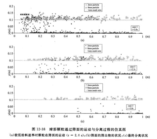 DEM仿真的過程信息能夠在線不同篩分工作條件下顆粒再篩面的運動、顆粒同篩面之間的碰撞過程、顆粒通過篩網(wǎng)的分離過程,反映了不同力度顆粒在篩面上運動形態(tài)的差異,再現(xiàn)不同篩分機工作條件下顆粒運動過程,較為真實的描述顆粒同篩面之間的碰撞過程。圖12-38為Li等人模擬2mm和8mm球形顆粒通過篩面的運動與分離過程圖。